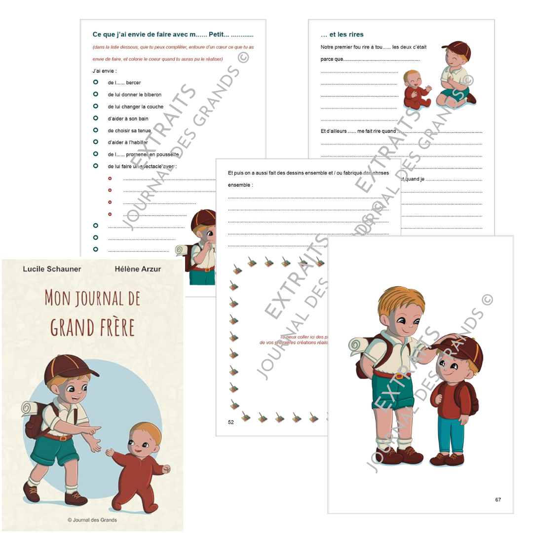 Ce journal est illustré de deux personnages : le grand frère / la grande soeur et bébé, que l’on voit évoluer depuis l’annonce de la grossesse jusqu’à la première rentrée de bébé à l’école maternelle.